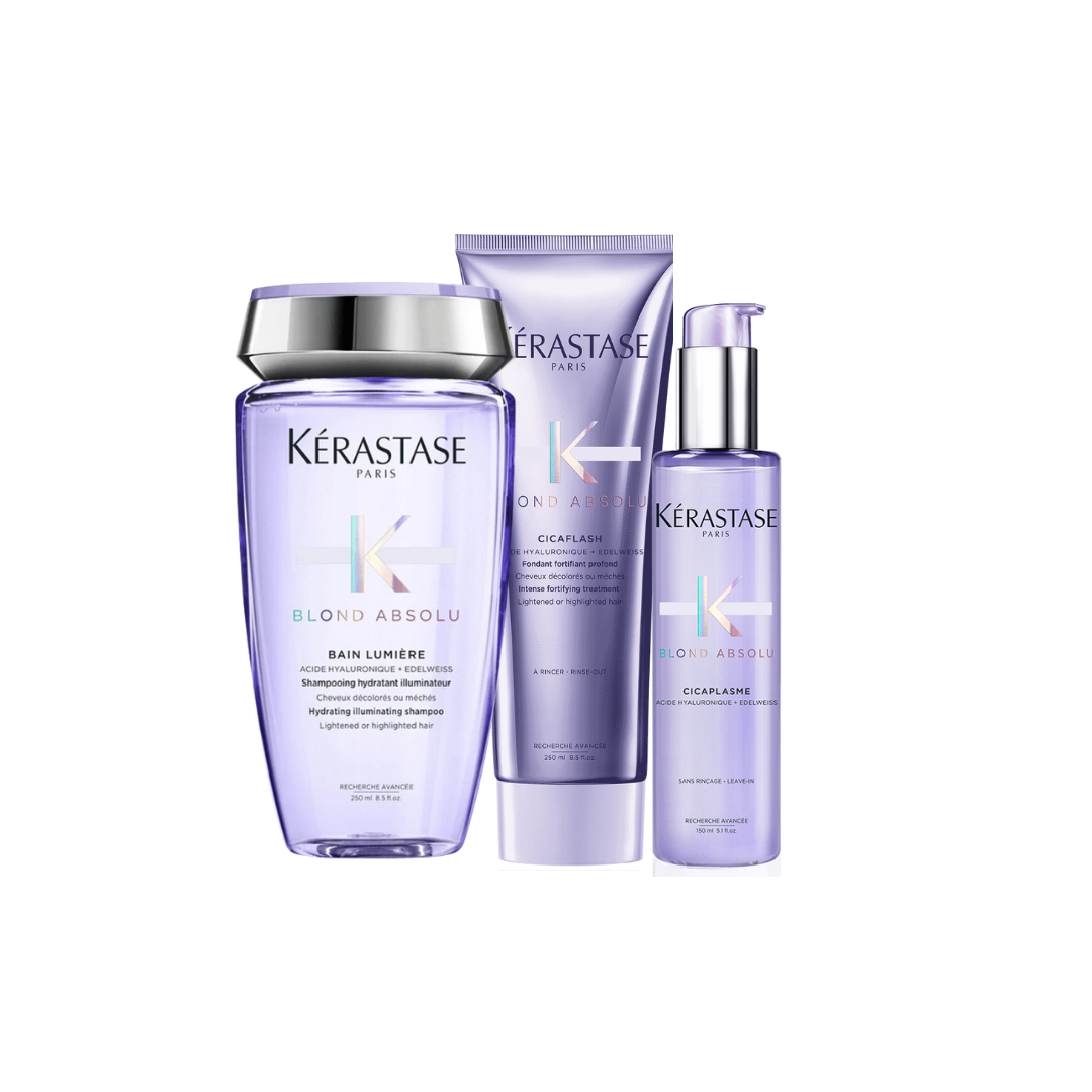 La línea Blond Absolu de Kérastase es el tratamiento definitivo para cabellos rubios, decolorados o con mechas. Formulada con potentes ingredientes como el Ácido Hialurónico y la Flor de Edelweiss, esta colección combate la sensibilidad de la fibra capilar, neutraliza los tonos amarillentos y aporta una hidratación intensa, dejando el cabello rubio más fuerte, luminoso y saludable.