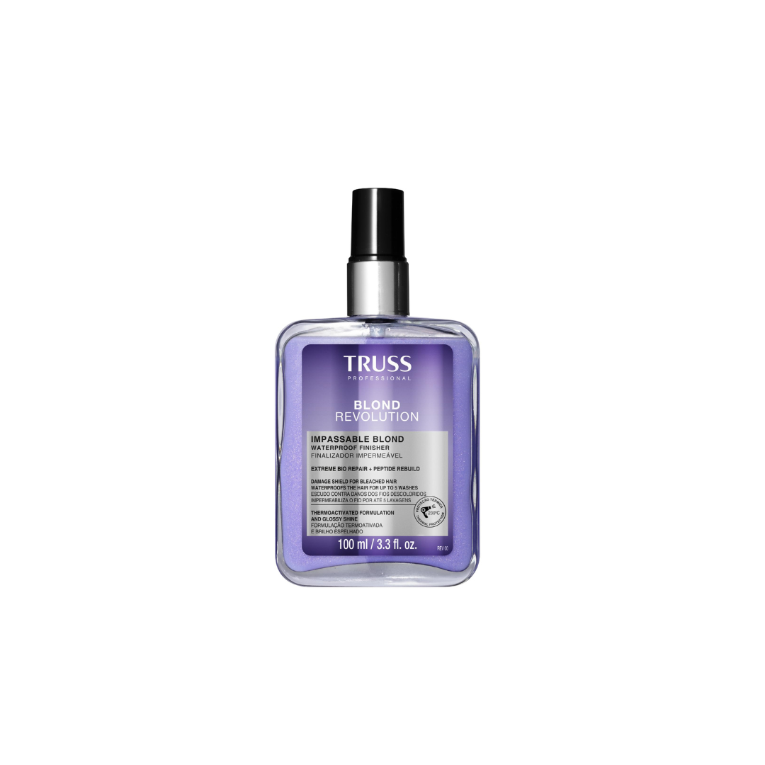 El TRUSS Blond Revolution Impassable Blond Finisher es un producto de acabado profesional diseñado para proteger y realzar el cabello rubio o decolorado. Su fórmula innovadora crea una barrera impermeable activada por el calor, proporcionando hasta cinco lavados de protección contra la humedad, el frizz y los daños térmicos.